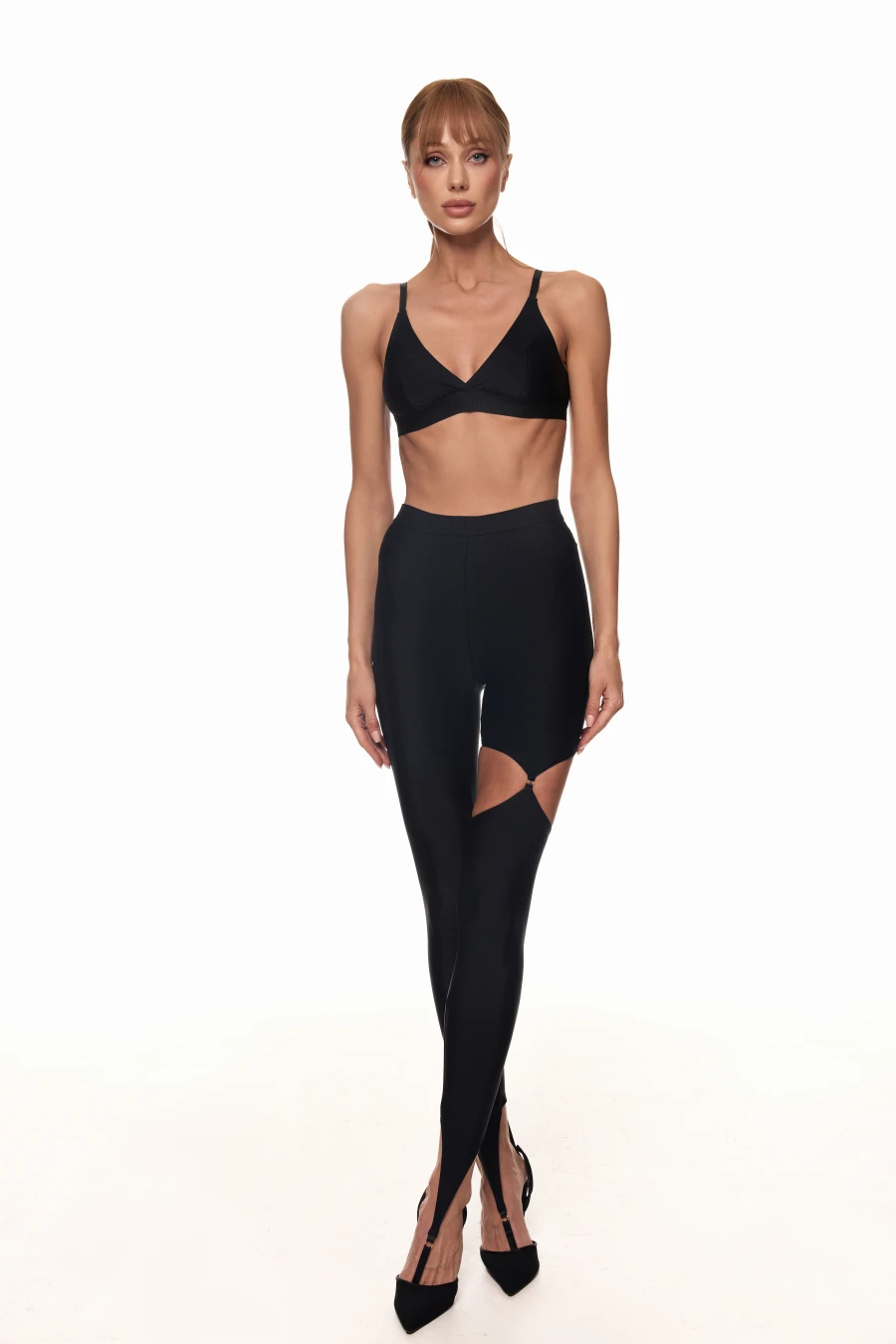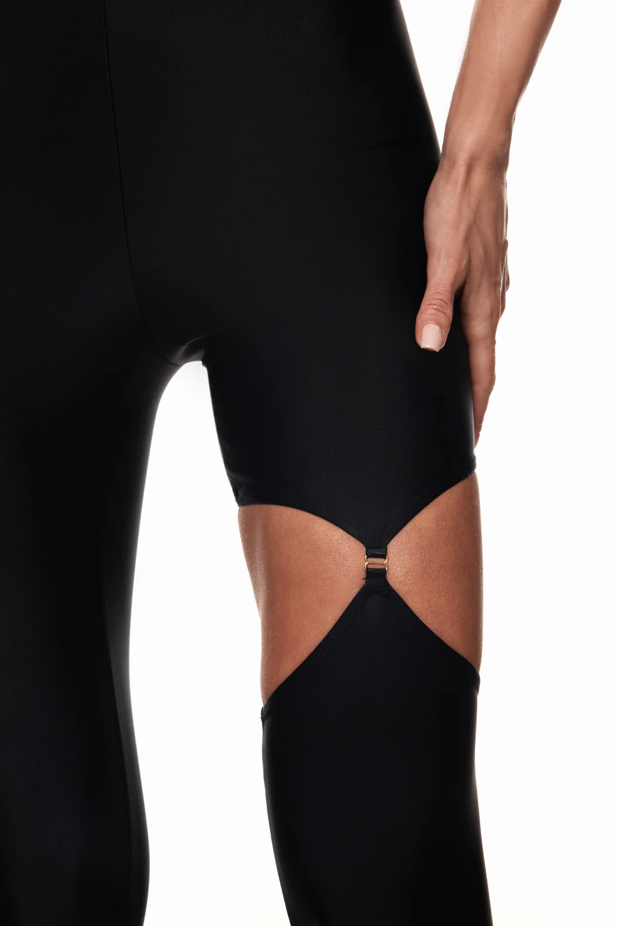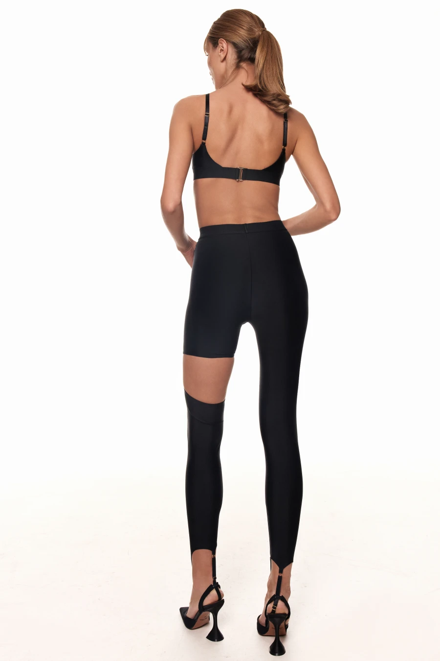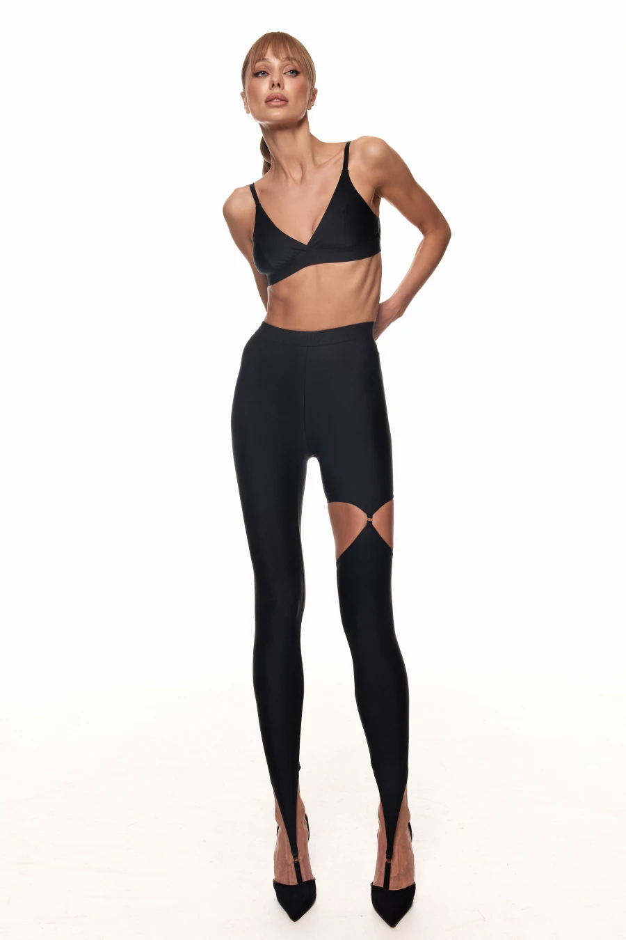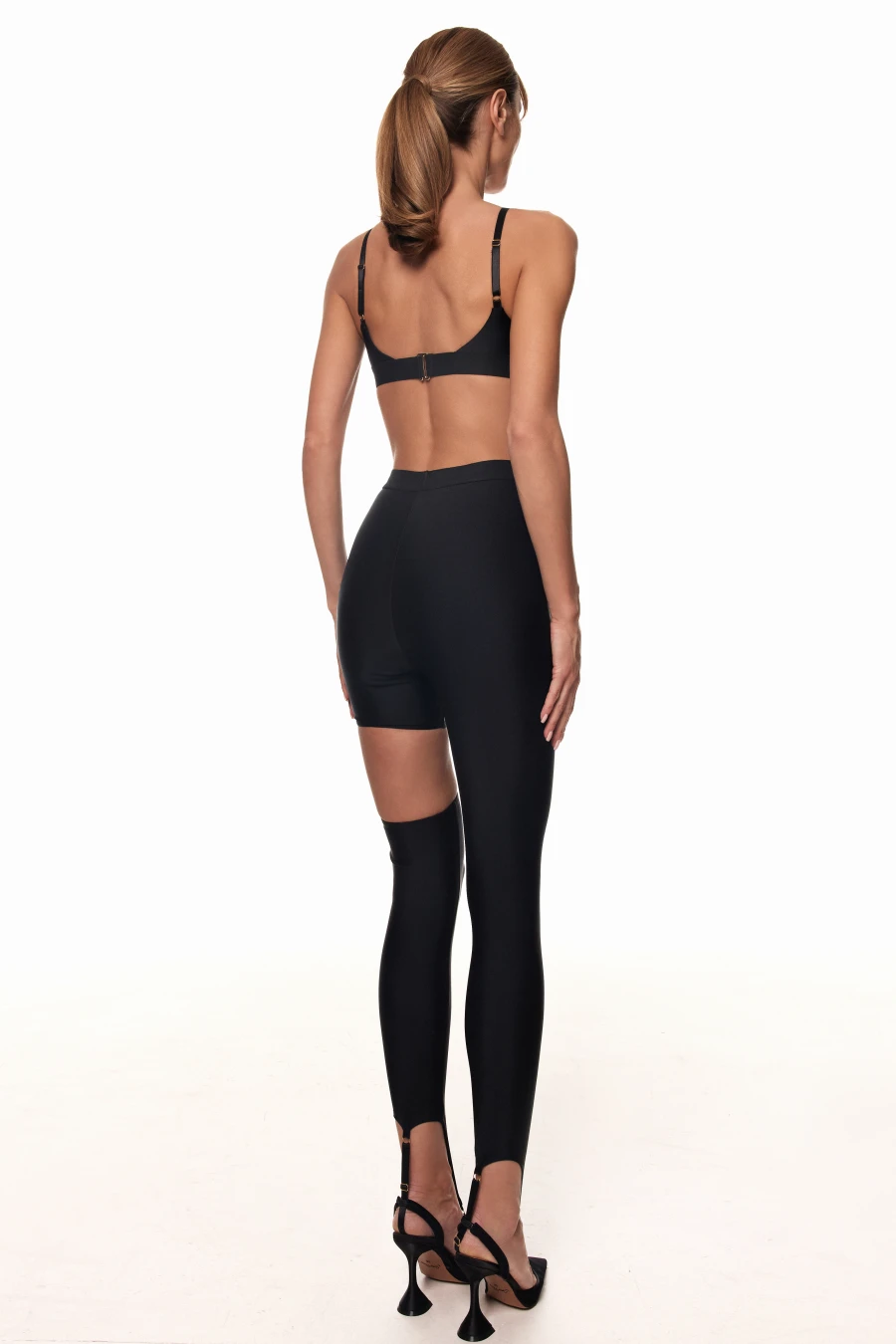 Легінси з напівпрозорої сітки, які візуально подовжують ноги й акцентують талію. Висока посадка з щільним поясом MLN м’яко фіксує лінію талії, а геометрія швів створює ефект «виточеного» силуету. Розріз вище коліна з’єднаний кільцем — деталь, що додає образу сексуальності та настрою вечірнього виходу.