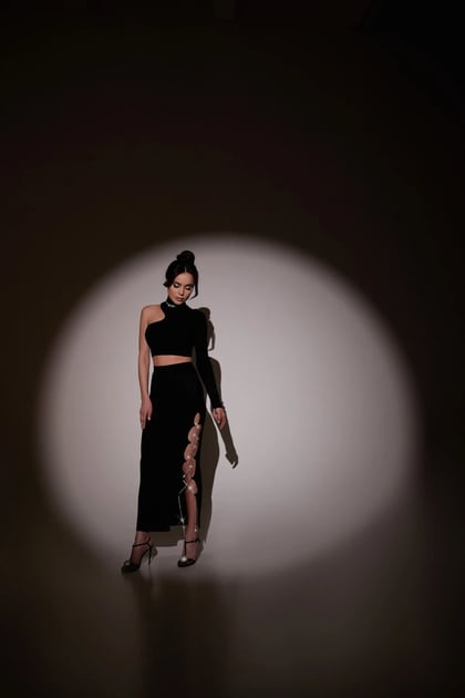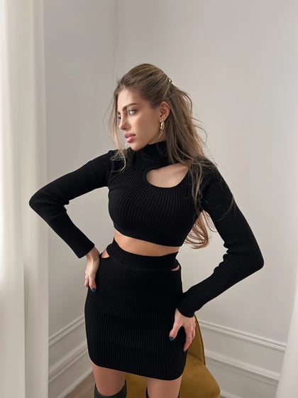 Елегантна в'язана спідниця має витончений та ледь помітний виріз на поясі, що додає легкої загадки до образу та чудово гармонує з вирізом на ніжці. Поєднується з будь-яким топом бренду, а особливо з топом асиметрія з рукавом та без.