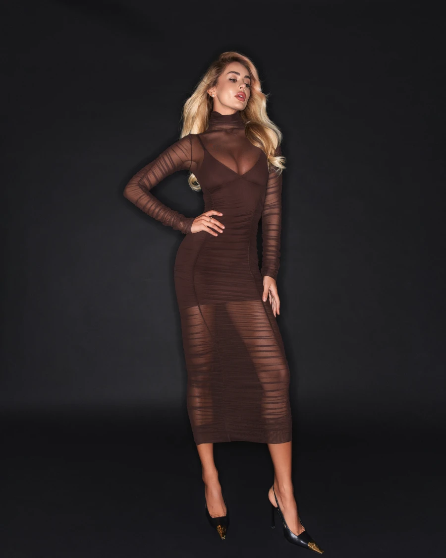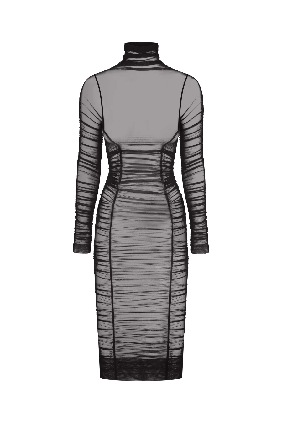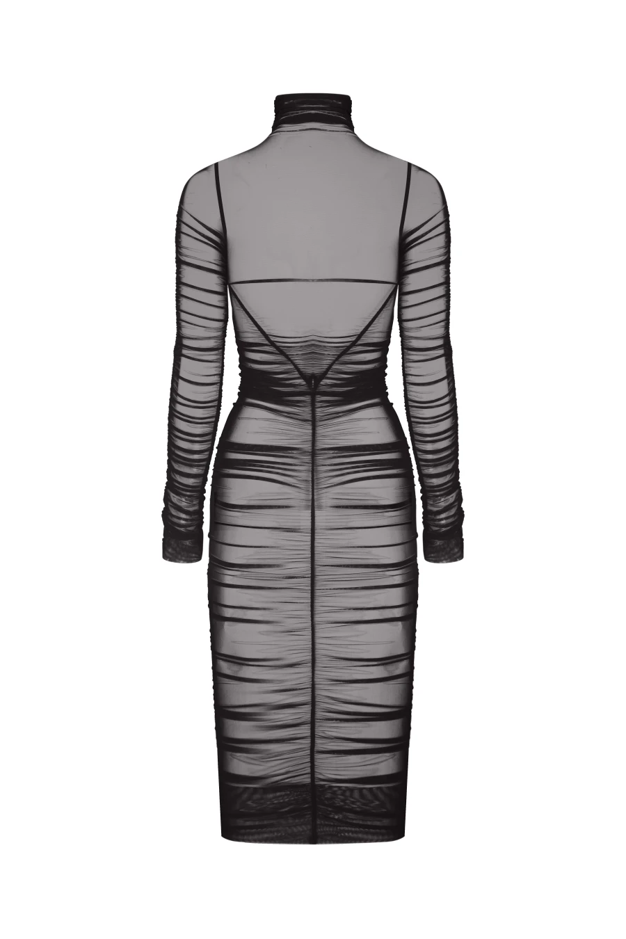 Сукня-сітка Loren міді з драпіруванням по всій довжині. Високий комір і довгий рукав врівноважують прозорість тканини. Рекомендується комбінувати з комбінацією Loren для більш закритого образу або з боді Loren для акценту на силует.