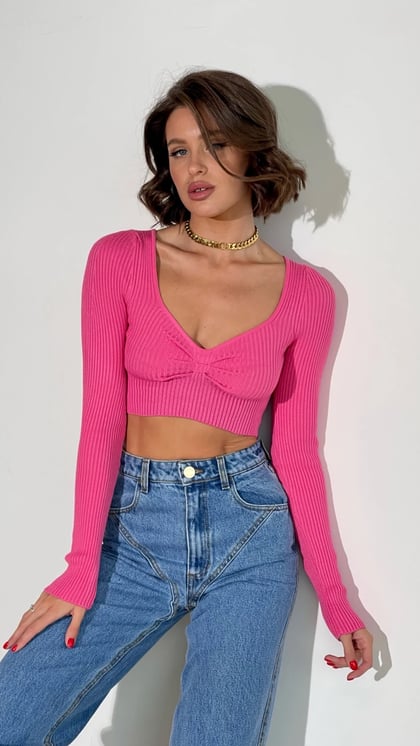 В'язаний топ у рубчик з декором у вигляді банта на грудях та довгими рукавами. Приємний до тіла матеріал виробу складається з віскози із додаванням стрейчу для ідельної посадки. Виріб складається з цільов'язаних деталей без використання оверлоку.