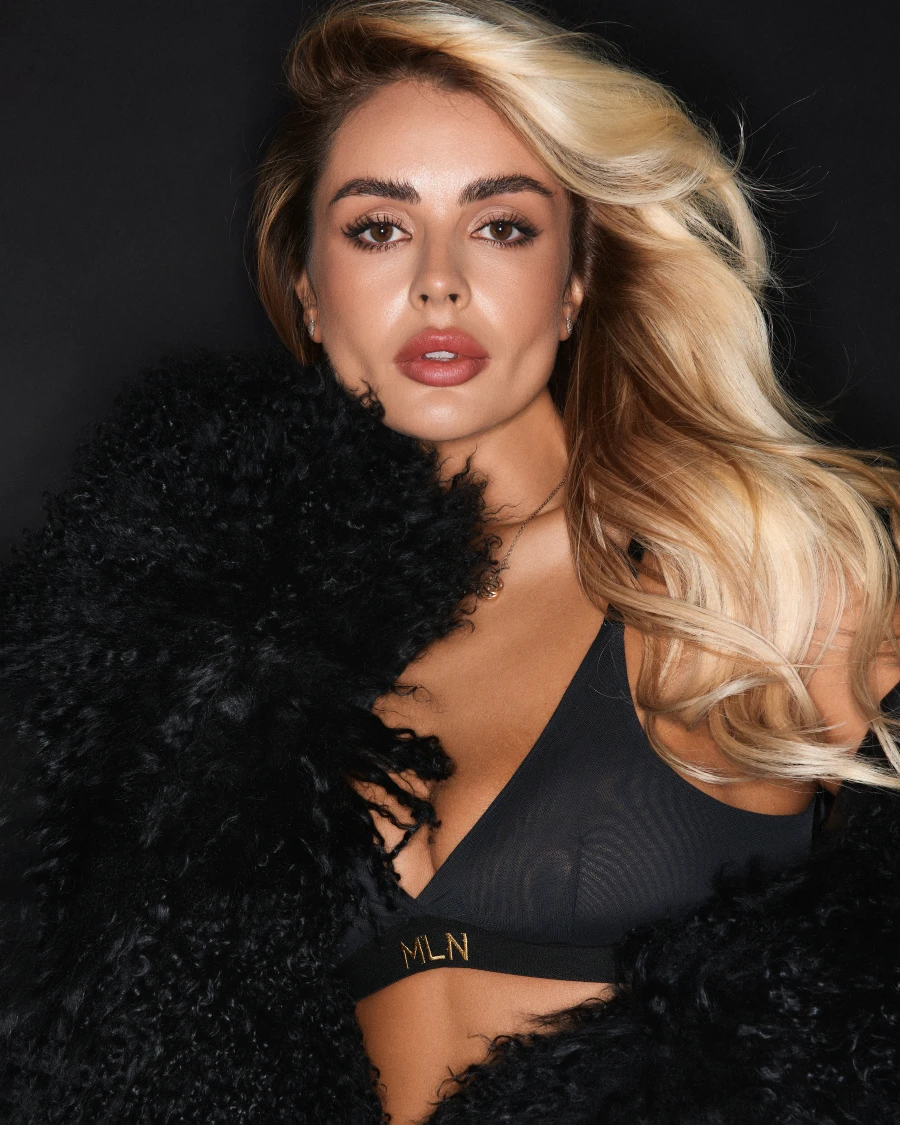 Лаконічний чорний бра-топ трикутного крою, який підкреслює лінію декольте й залишає відчуття «другой шкіри». Напівпрозора сітка м’яко окреслює форми, а еластична лінія під грудьми з логотипом MLN акуратно фіксує топ і додає йому спортивно-сексуального характеру.