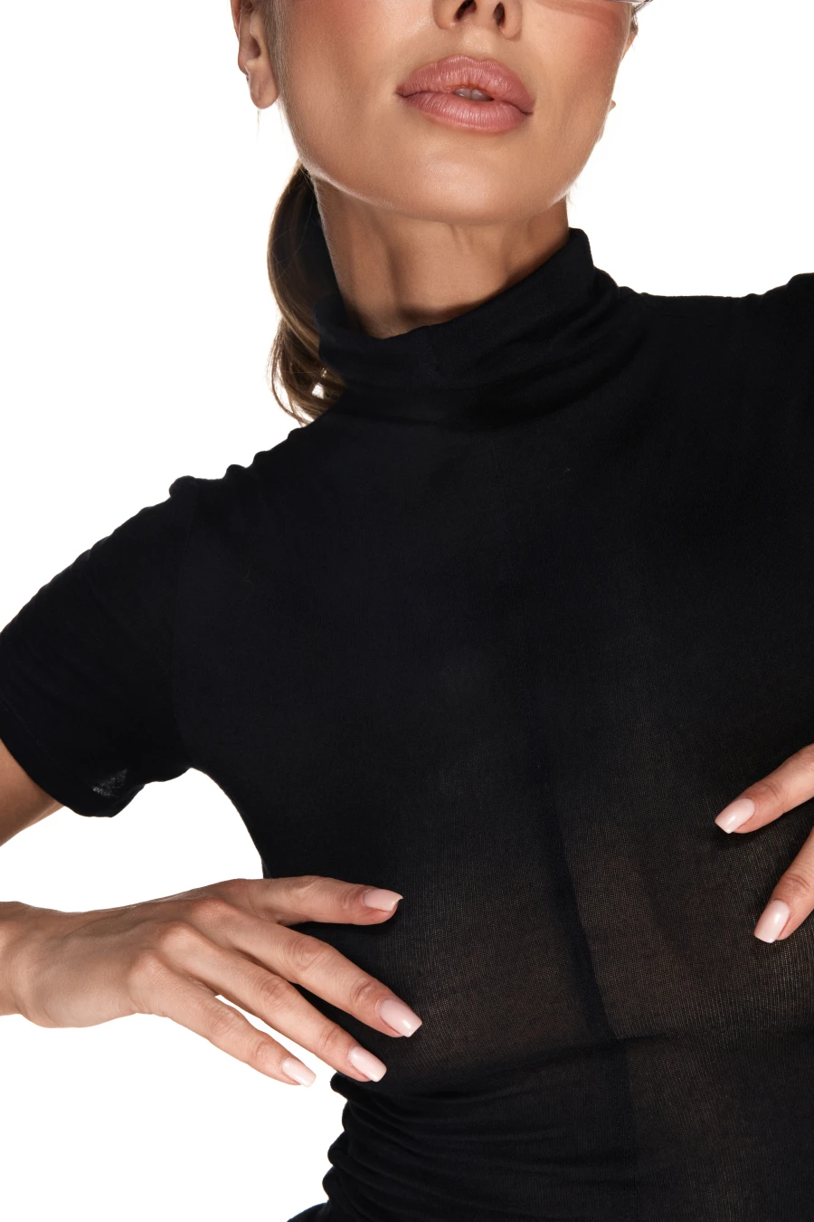 Топ із напівпрозорої сітки. Висока горловина, короткий рукав і ефект другої шкіри формують зібраний, чуттєвий образ без зайвих деталей.